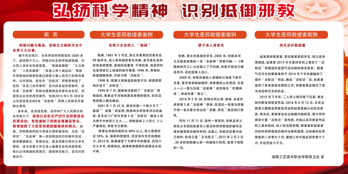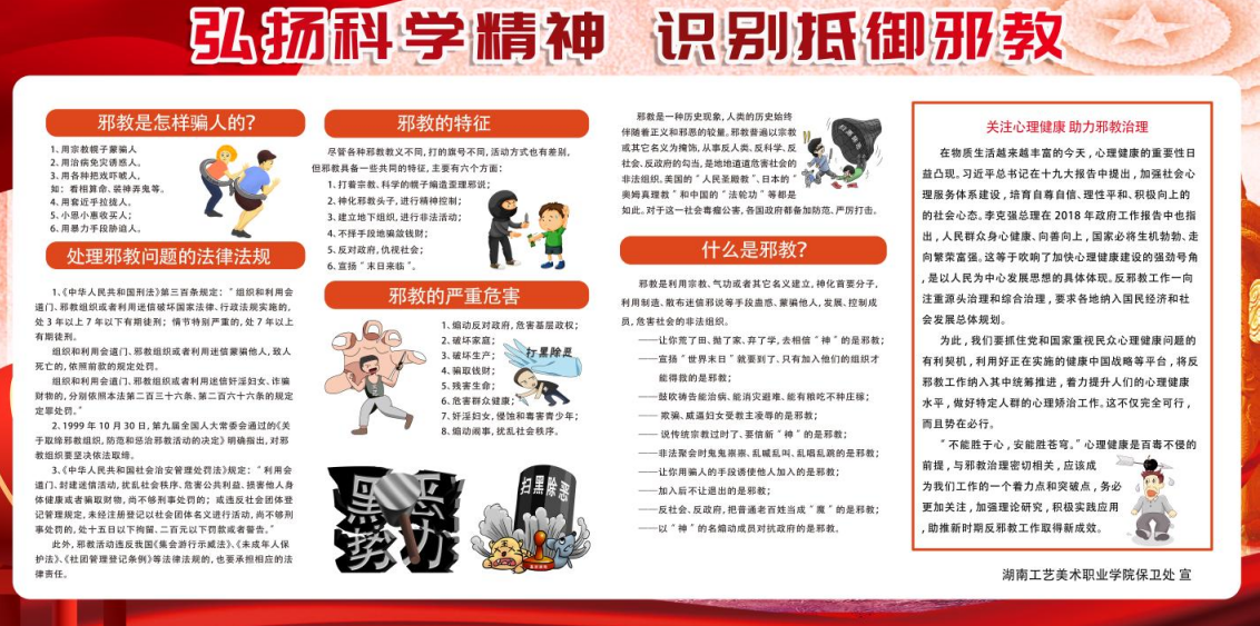 活动以引导师生在“中国反邪教”公众号上进校自学、进行专题展览等形式开展,倡导师生反对邪教、破除迷信、崇尚科学、传播文明。各学院通过多样化教育手段,积极营造崇尚科学、反对邪教的氛围,引导学生树立正确的世界观、人生观、价值观,增强广大师生认识和抵制邪教的意识与能力。