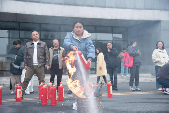 随后,在湖南智安卫士消防科技公司教官的组织引导下教职工进行初期火灾的逃生演练,以及学习怎样才能临危不乱,正确使用灭火器进行初期火情的处理。