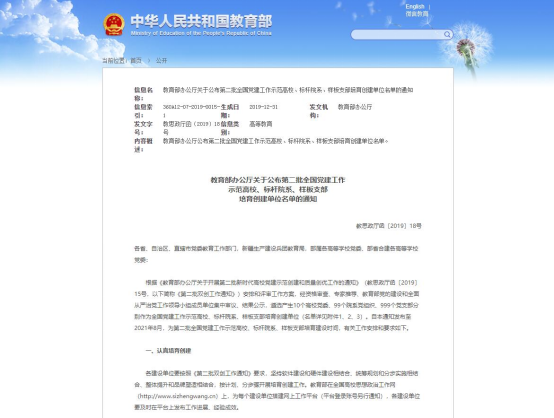 经资格审查、专家推荐、教育部党的建设和全面从严治党工作领导小组成员单位集中审议和公示等环节,最终遴选出第二批新时代高校党建示范创建和质量创优工作培育创建单位,建设周期为两年。