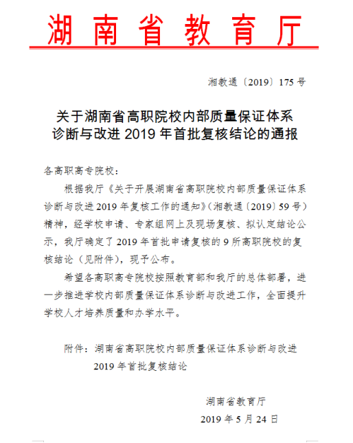 5月24日,我校顺利通过了湖南省高职院校内部质量保证体系诊断与改进2019年首批复核,复核结论为“有效”。