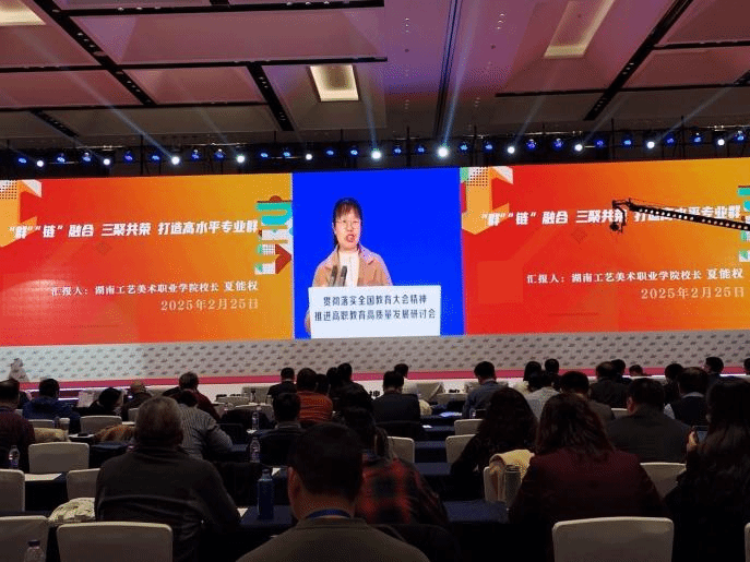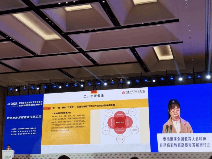 在会议25日下午举办的“职业教育关键要素改革”论坛上,学校校长夏能权做题为《“群”“链”融合 三聚共荣 打造高水平专业群》的典型发言,向与会人员介绍了我校专业群建设的经验与成果。近年来,学校聚焦湖湘工艺美术重点特色产业、聚焦湖湘工艺美术重点特色产业链高端人才培养、聚焦湖湘工艺美术特色产业核心文化和技艺,构建了与湖湘工艺美术产业深度对接的刺绣设计与工艺专业群;通过聚力建设“互培、互聘”的教学团队、“互需、互享”的教学资源、“互管、互用”的教学基地,建设了专业群与湖湘工艺美术产业高度共享的优质资源;通过创新“三双”(双导师、双基地、双交替)人才培养模式、创新“三共”(平台共用、项目共研、成果共享)技术研发模式、创新“三同”(同保护、同创新、同传播)文化传承模式,打造了支撑湖湘工艺美术产业创新发展的人才、技术和文化三大支点,为湖南文创产业迈上10000亿台阶做出了贡献。