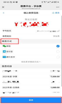 ③进入缴费平台-首页,再次核对学生信息。选择“学杂费”,进入“缴费平台-学杂费”,确认缴费信息,选择 “缴费方式”,点击“缴费”进行支付。