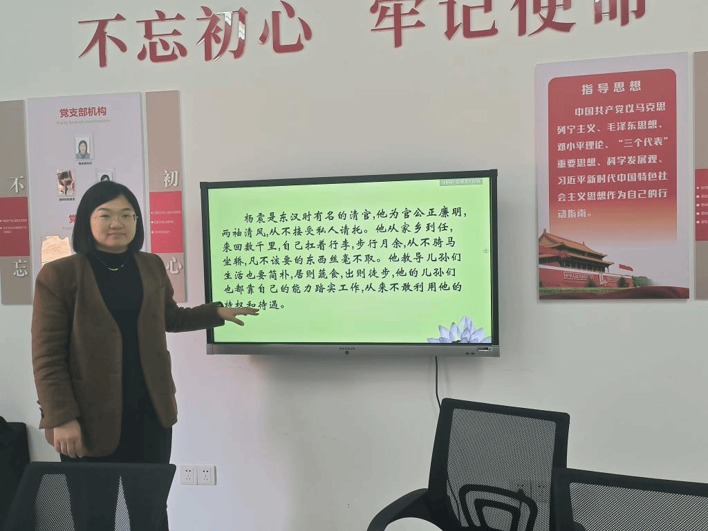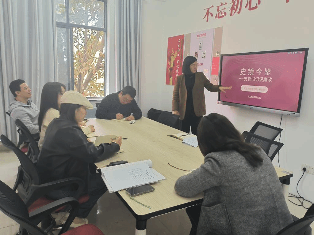 为扎实推进学习贯彻习近平新时代中国特色社会主义思想主题教育走深走实,提高党员廉洁自律意识,按照学校开展党风廉政建设月的活动要求和“一月一课一片一实践”主题党日活动要求,3月12日下午,党支部书记杨丽敏为支部全体教师讲授主题为《史镜今鉴说廉政》专题党课。