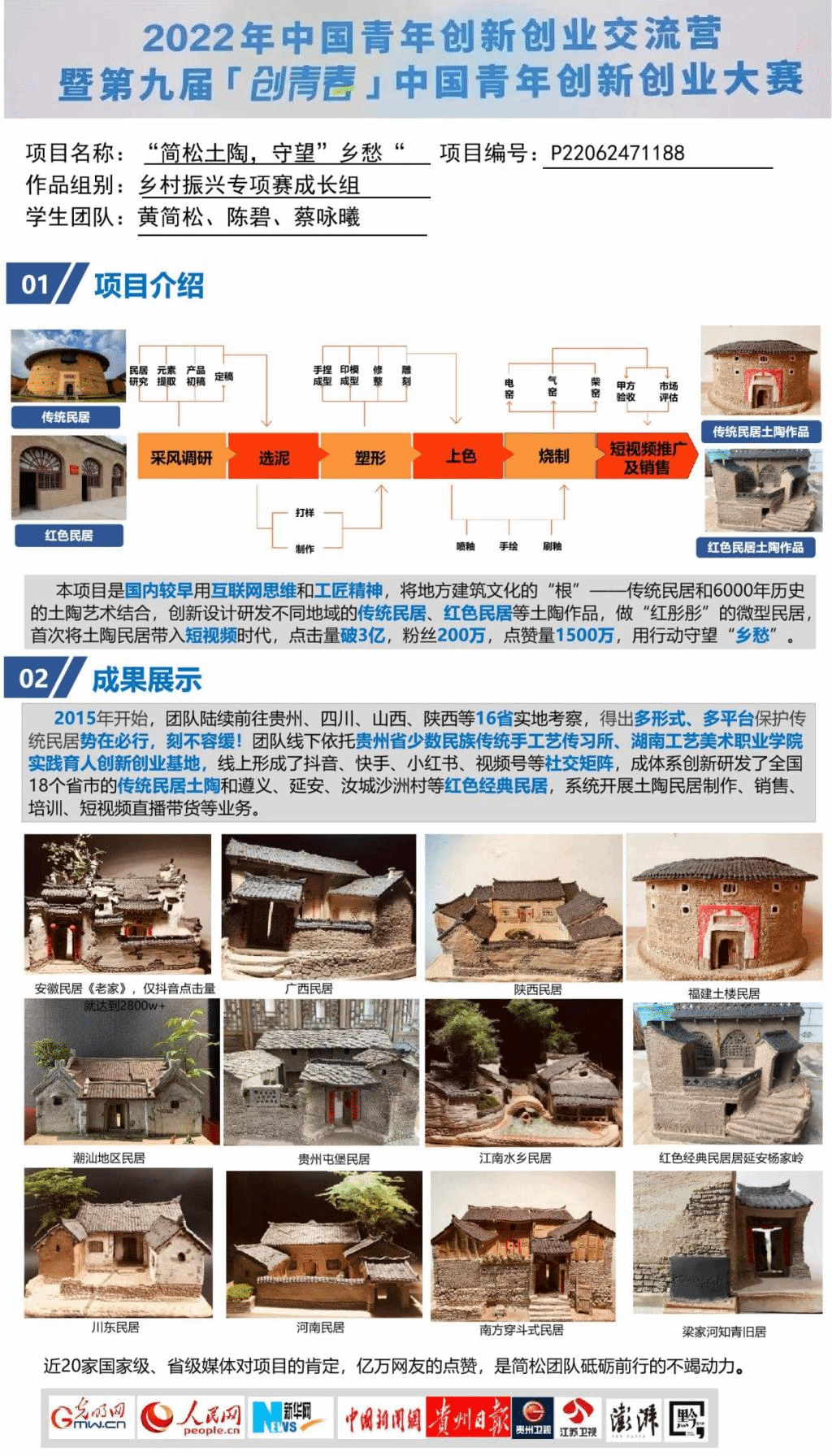 习近平总书记云南考察时指出“注意乡土味道,保留乡村风貌,留得住青山绿水,记得住乡愁。”该项目由2016届陶瓷艺术设计专业毕业生黄简松领衔,是国内较早将传统民居和土陶艺术结合,创新设计研发全国不同地域的传统民居、红色民居等土陶系列作品,做“红彤彤”的微型土陶民居,并首次将土陶民居带入短视频时代。团队用行动“守望”乡愁,传承工匠精神,扎根贵州农村的创业事迹受到光明网、人民网、新华网、贵州日报等媒体报道,充分体现我校毕业生利用所学知识,扎根乡村,守望“乡愁”,助力乡村振兴事业。