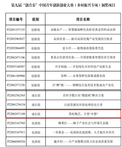 7月28日至7月29日,由共青团中央、人力资源和社会保障部、农业农村部、商务部、国家乡村振兴局和辽宁、江苏、湖北、江西省人民政府共同主办的2022年中国青年创新创业交流营暨第九届“创青春”中国青年创新创业大赛在江苏省盐城市启动。由创新创业教育学院、校团委组织选拔推报、经层层筛选,我校“简松土陶,守望‘乡愁’”项目晋级该赛事国赛,通过激烈角逐,最终荣获第九届“创青春”中国青年创新创业大赛(乡村振兴专项)成长组全国铜奖,实现了我校首次参加该赛事就获得国赛铜奖的佳绩。