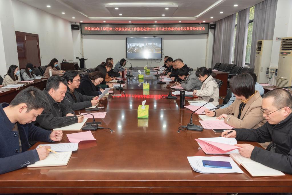 为深入学习贯彻党的二十大精神,贯彻落实教育部、人社部关于高校毕业生就业创业工作相关任务和精神,落实湖南省教育厅2023届毕业生春季促就业攻坚行动的决策部署,准确把握和研判当前就业形势,全面动员部署下一步就业工作,3月28日上午,学校组织召开2023年上学期第二次就业创业工作推进会暨2023届毕业生春季促就业攻坚行动布置会,全力推进2023届毕业生就业创业工作,全力促进毕业生更加充分更高质量就业。校长夏能权出席会议并作讲话。各二级学院党政班子、相关职能部门负责人、校院就业创业专职人员、2023届毕业班辅导员以及创新创业教育学院全体成员等近50人参加会议。会议由副校长张华主持。