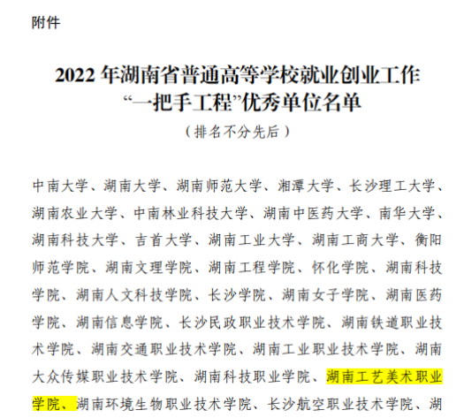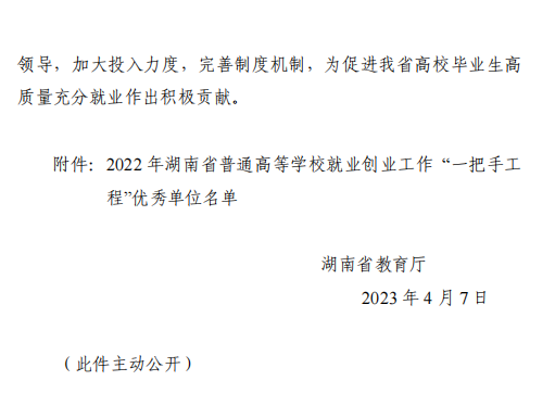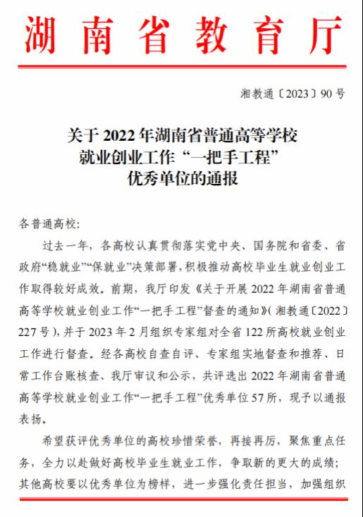 近日,湖南省教育厅《关于2022年湖南省普通高等学校就业创业工作“一把手工程”优秀单位的通报》(湘教通〔2023〕90号)公布了2022年全省高校就业创业“一把手工程”优秀单位,我校获评2022年湖南省普通高等学校就业创业工作“一把手工程”优秀单位,这是学校第六次获评就业创业工作“一把手工程”优秀单位。