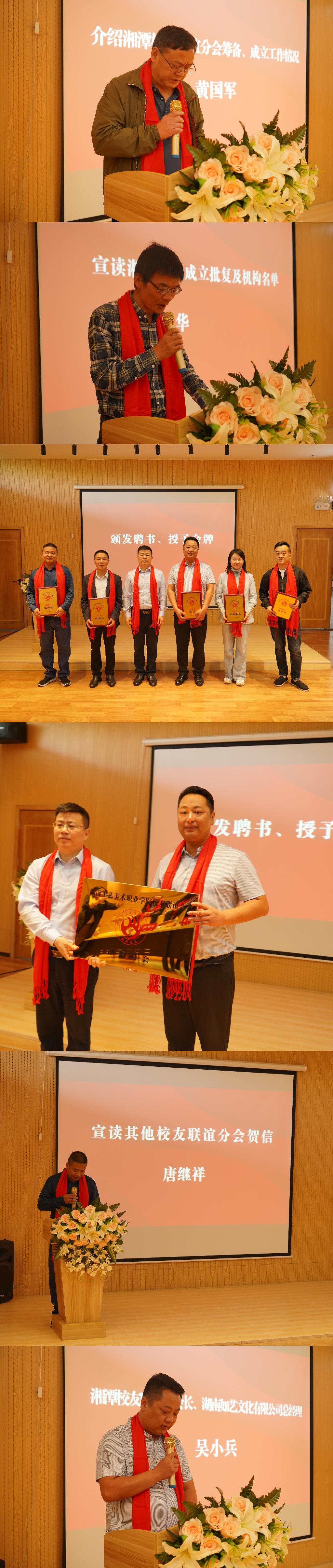 会上,校友会秘书长黄国军介绍了湘潭校友联谊分会筹备、成立工作情况以及校友联谊分会基本要求和下一步工作计划,环境艺术设计学院党总支书记吴国华宣读了校友联谊会湘潭分会组织架构名单,张华代表学校为湘潭校友联谊分会授予会牌,为会长吴小兵,副会长许慧轩、唐继祥,秘书长冯鑫,副秘书长李文才颁发聘书。2005届校友、湘潭如艺文化有限公司董事长吴小兵当选为校友联谊会湘潭分会会长并讲话。