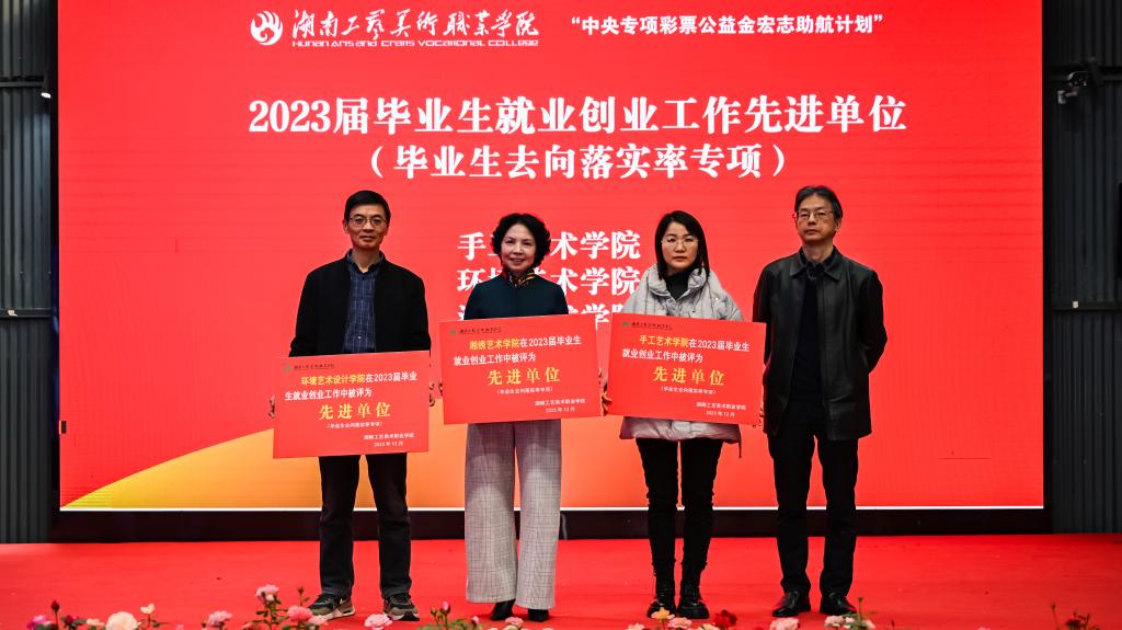 启动会上,夏能权代表学校全体师生向莅临现场的各位领导、嘉宾表示衷心感谢,向参加招聘会的集团内外用人单位代表、校友表示热烈欢迎。她表示,举办此次校园招聘会,目的就是为毕业生和用人单位搭建优质精准的就业服务平台,促进毕业生更高质量充分就业。近年来,学校建立了惠及全体学生的就业工作体系和“作品载体,三阶递进、全程融入”的创新创业教育体系,实现毕业生和用人单位“两个满意”,希望用人单位都能选拔到优秀人才,全体2024届毕业生都能顺利找到适合的工作。陈鸿俊为获得2023届毕业生就业创业工作先进单位(毕业去向落实工作专项)颁奖,校长夏能权为9名2023届毕业生就业创业工作先进个人(毕业生去向落实率专项)颁奖。2024届毕业生代表周莹月同学代表毕业生发言,湖南金煌建筑装饰设计工程有限公司人力资源部经理肖霄代表用人单位发言。