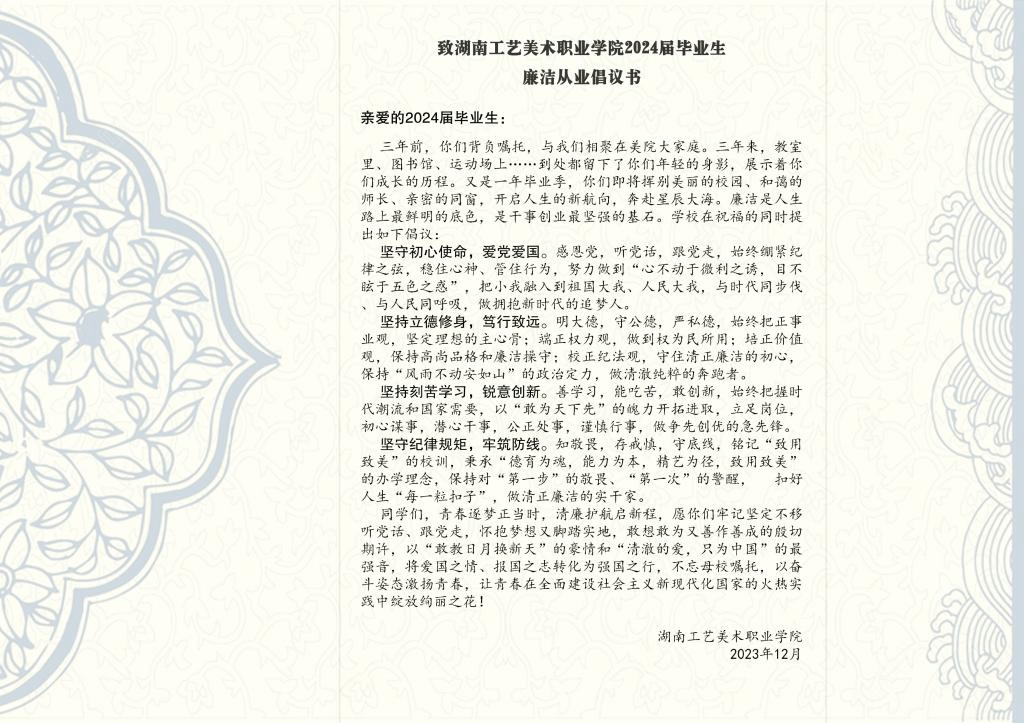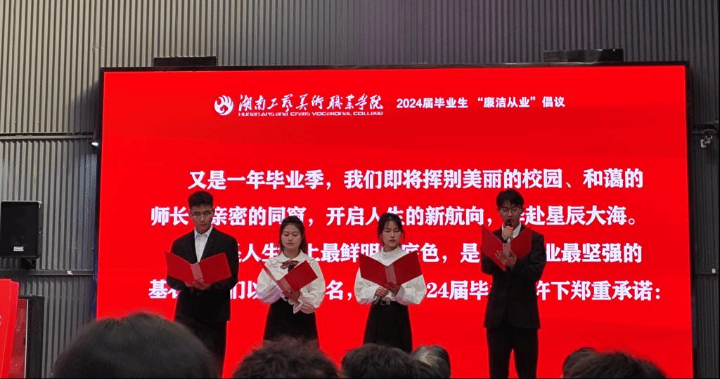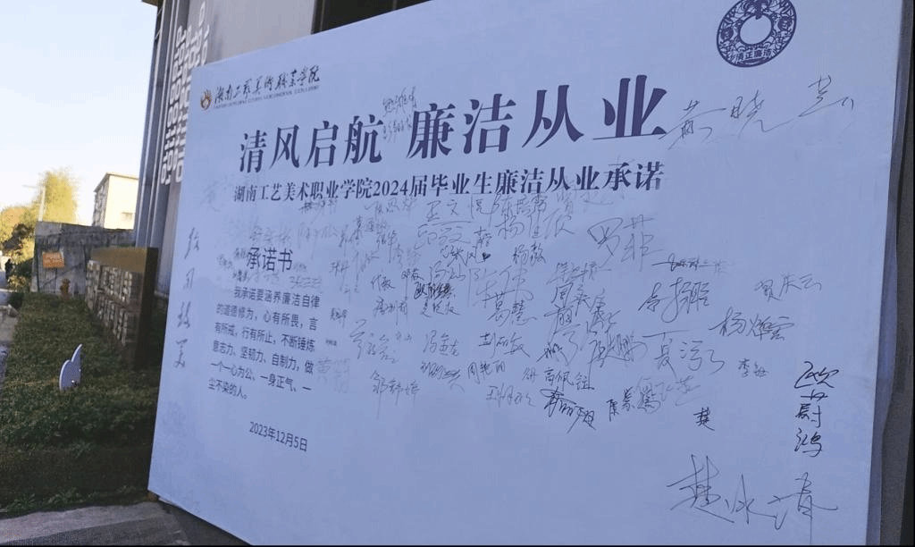 12月5日,在学校宏志助航计划·湖南工艺美院2024届毕业生供需见面会暨湖南工艺美术职教集团2023年招聘会启动会上,学校领导、教师、毕业生纷纷在“廉洁从业”签名墙上郑重写下廉洁承诺。4名毕业生代表宣读了2024届毕业生廉洁从业倡议书,毕业生纷纷表示离校前许下的廉洁承诺将始终警醒他们心有所畏、言有所戒、行有所止,擦亮青春底色,书写新时代“清廉答卷”。服装艺术学院服工2103班的苏奇华承诺:“坚定理想信念,坚持立德修身;坚守纪律规矩,做廉洁自律的追梦人。”数字艺术学院数媒2101班葛亚萍承诺:“在未来的工作中,我将会正确处理公与私、名与利、是与非、正与邪、苦与乐的关系,努力做到一身正气、一尘不染”。