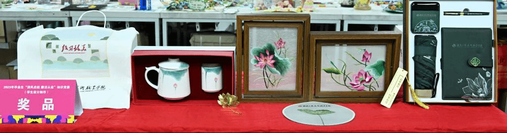 以廉洁文化作品,寄母校殷切期盼。学校创新创业教育学院在学生中征集“廉洁从业”网络知识竞赛的系列奖品,学生以莲花为元素,设计了廉洁书签、鼠标垫、戒尺以及莲花湘绣作品、陶瓷杯子、办公文具等,学生赛事的奖品,由学生自己设计,满满的“美院味”,通过系列廉洁文创作品,寄语2024届毕业生掌好廉洁的舵轮,时刻提醒他们要守住廉洁底线。
