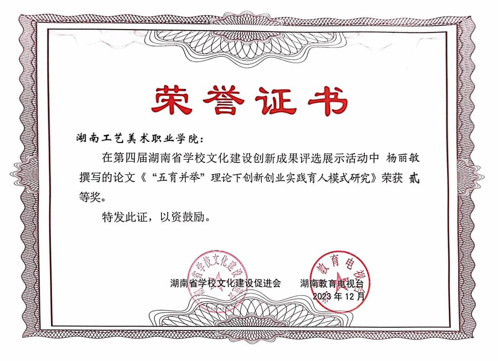 12月8日,第五届湖南省文化强校互动论坛暨学校文化建设创新成果展示活动在湖南益阳举行。我院杨丽敏老师撰写的论文《五育并举”理论下创新创业实践育人模式研究》荣获湖南省文化建设创新成果二等奖。