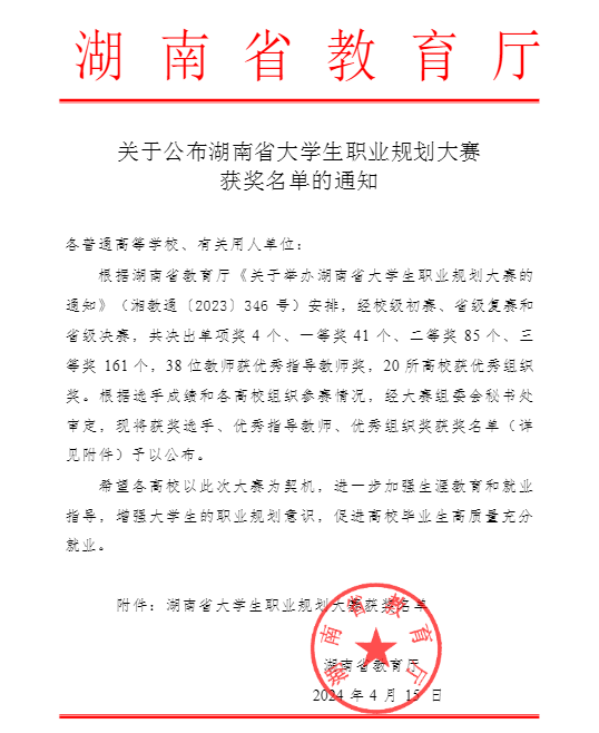 本次大赛由湖南省教育厅主办,中南出版传媒集团股份有限公司、湖南师范大学、湖南省大中专学校学生信息咨询与就业服务中心承办。大赛设学生成长赛道和就业赛道,每个赛道设高教组和职教组。自2023年11月启动以来,大赛吸引了来自省内134所高校的64.62万名大学生积极报名参与。经过校级初赛、省级复赛、省级决赛的激烈角逐,我校学生王勉、李佳原在职教组就业赛道分获三等奖两项。