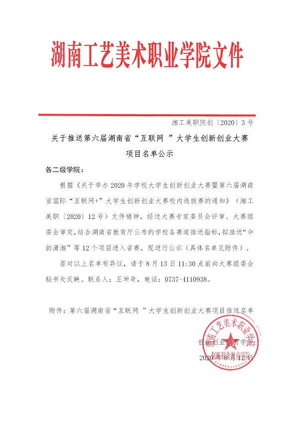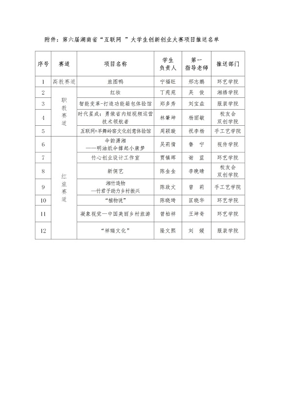 关于推送第六届湖南省“互联网 ”大学生创新创业大赛项目名单公示