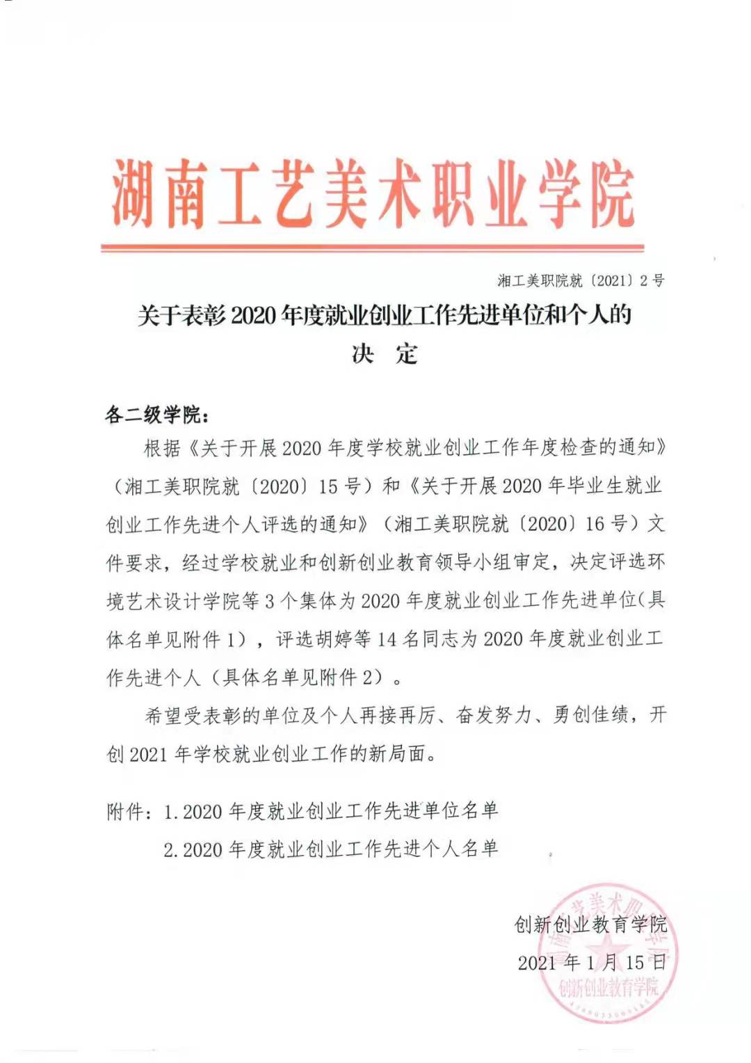 湘工美职院就〔2021〕2号关于表彰2020年度就业创业工作先进单位和个人的决定.pdf