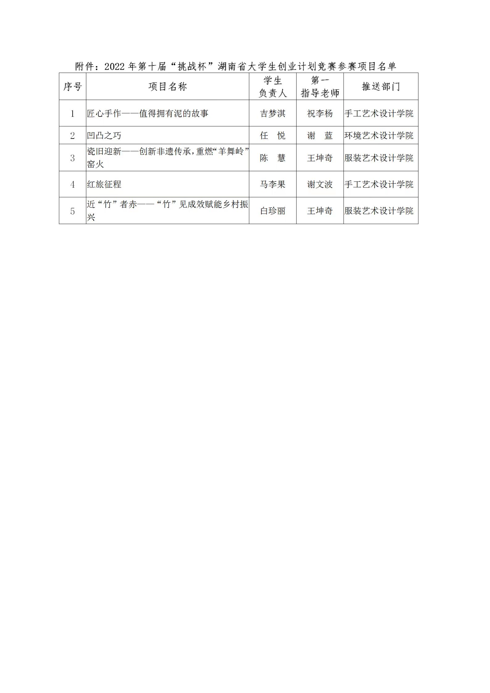关于推送我校2022年第十届“挑战杯”湖南省大学生创业计划竞赛参赛项目名单