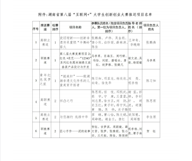 关于推送第八届湖南省“互联网+”大学生创新创业大赛项目名单公示