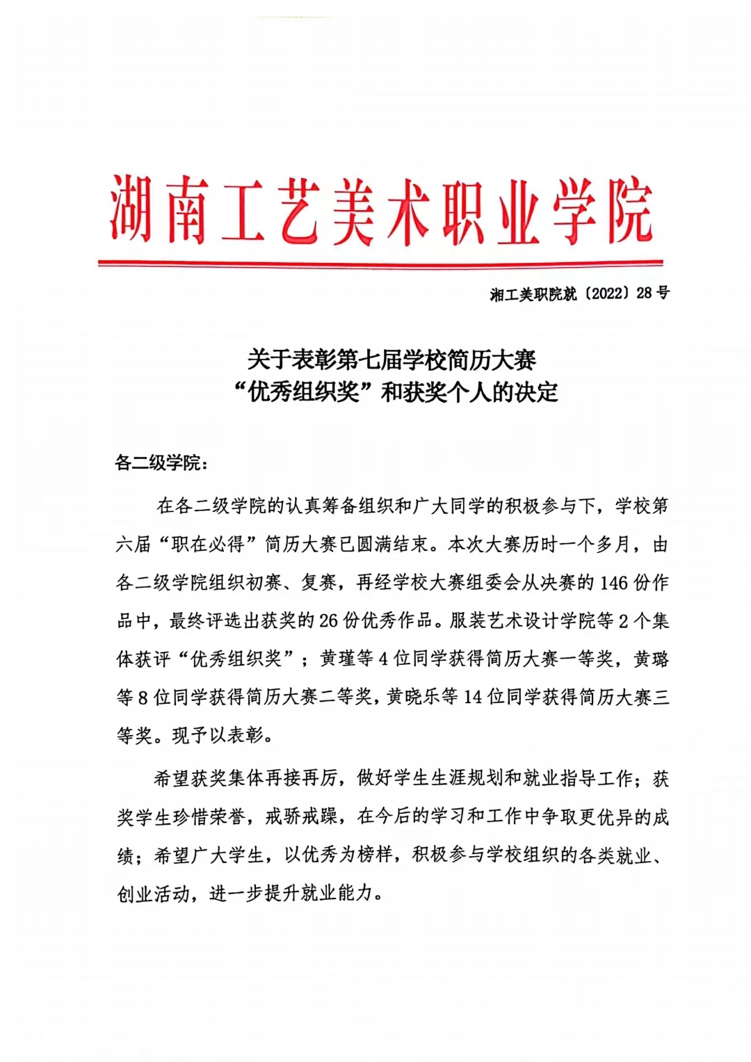 关于表彰第七届学校简历大赛“优秀组织奖”和获奖个人的决定