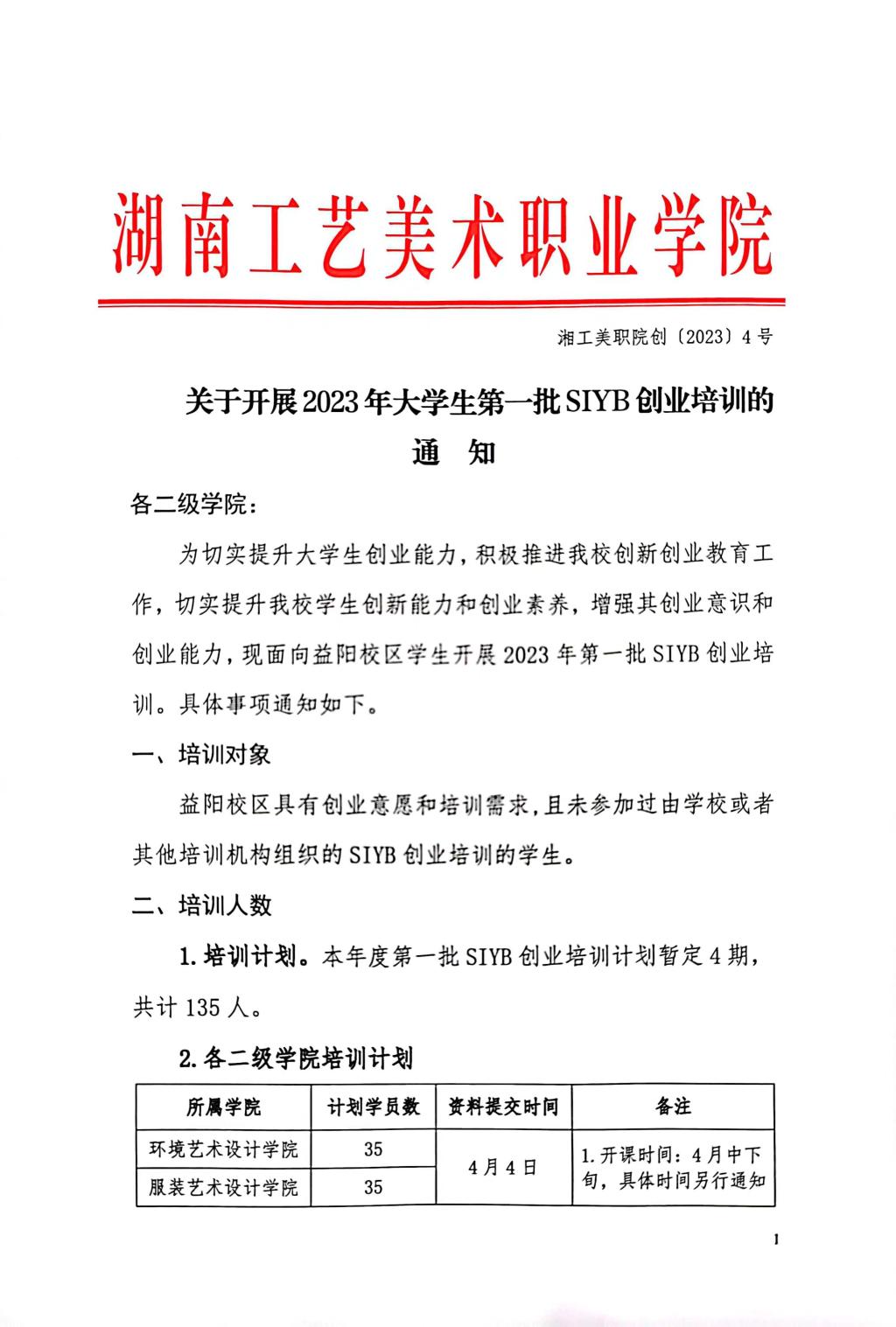 湘工美职院创〔2023〕4号 关于开展2023年大学生第一批SIYB创业培训的通知.doc