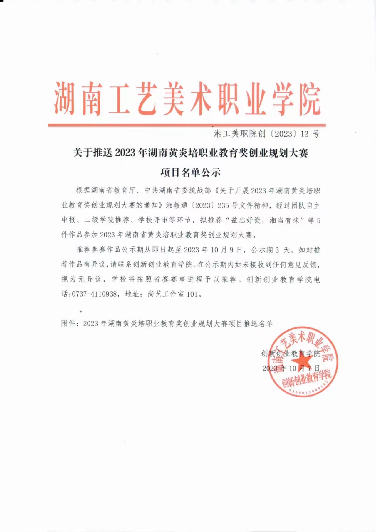 2023年湖南黄炎培职业教育奖创业规划大赛推参加省赛荐项目名单公示