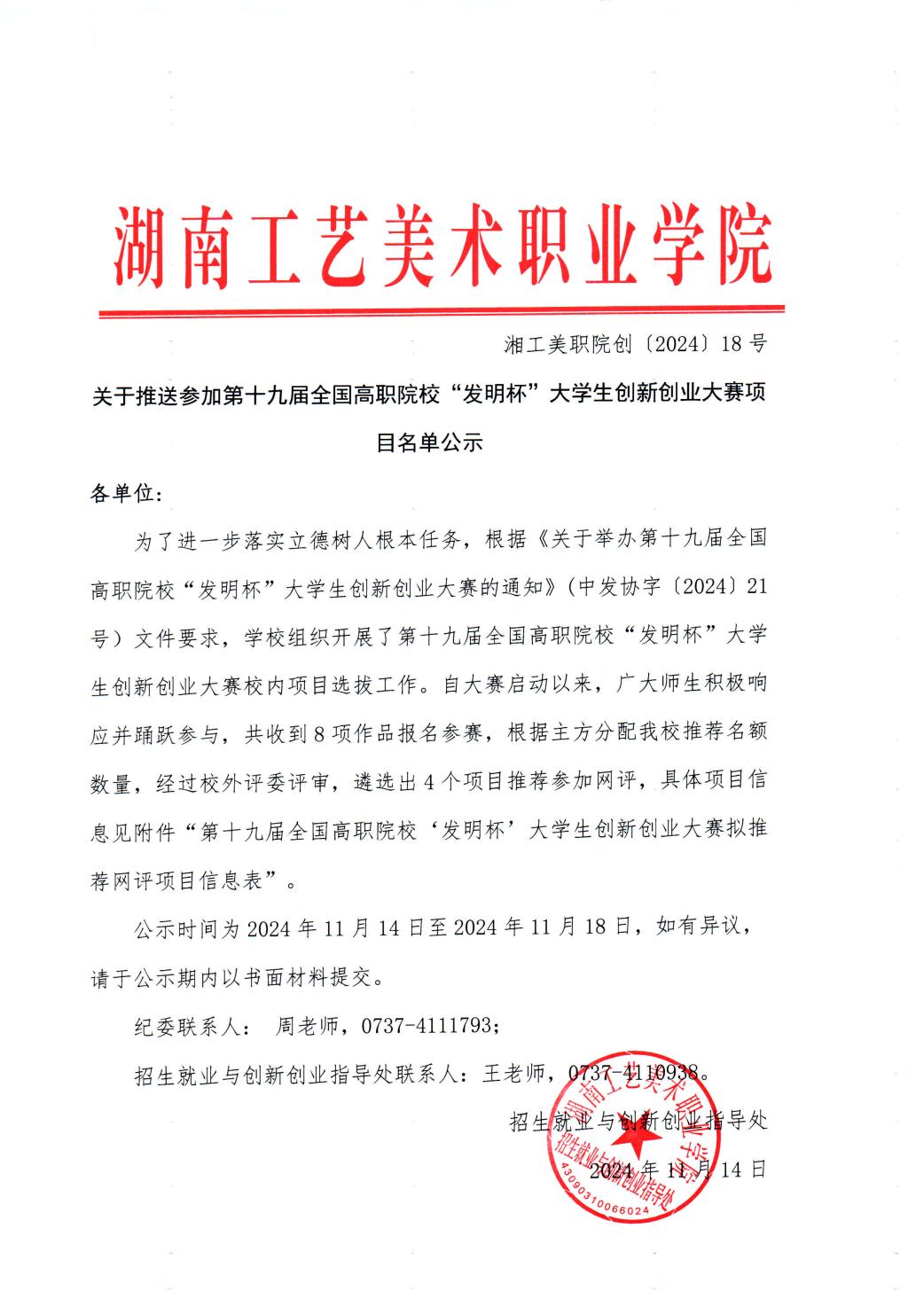 关于推送参加第十九届全国高职院校“发明杯”大学生创新创业大赛项目名单公示 湘工美职院创〔2024〕18号 (1).pdf