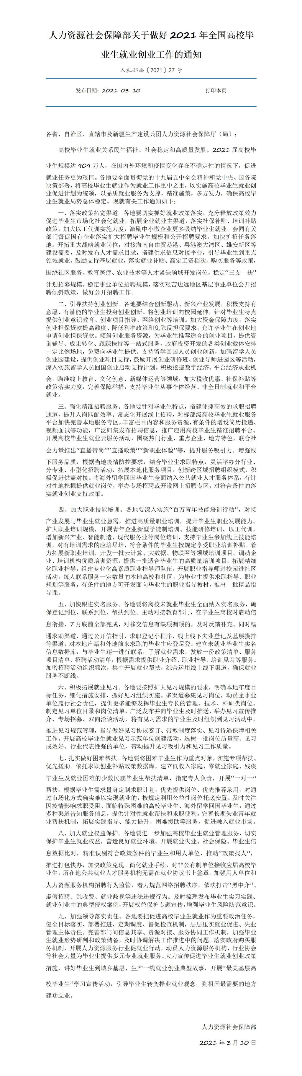 人力资源社会保障部关于做好2021年全国高校毕业生就业创业工作的通知
