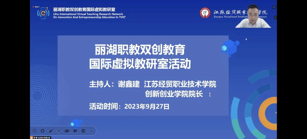 9月27日晚,我校就业创业专兼职教师参加了丽湖职教双创教育国际虚拟教研室第8期线上教研活动。本次活动由江苏经贸职业技术学院和无锡职业技术学院承办。本期教研活动为双创教学理论专题,由江苏经贸职业技术学院创新创业学院院长谢鑫建副教授主持。