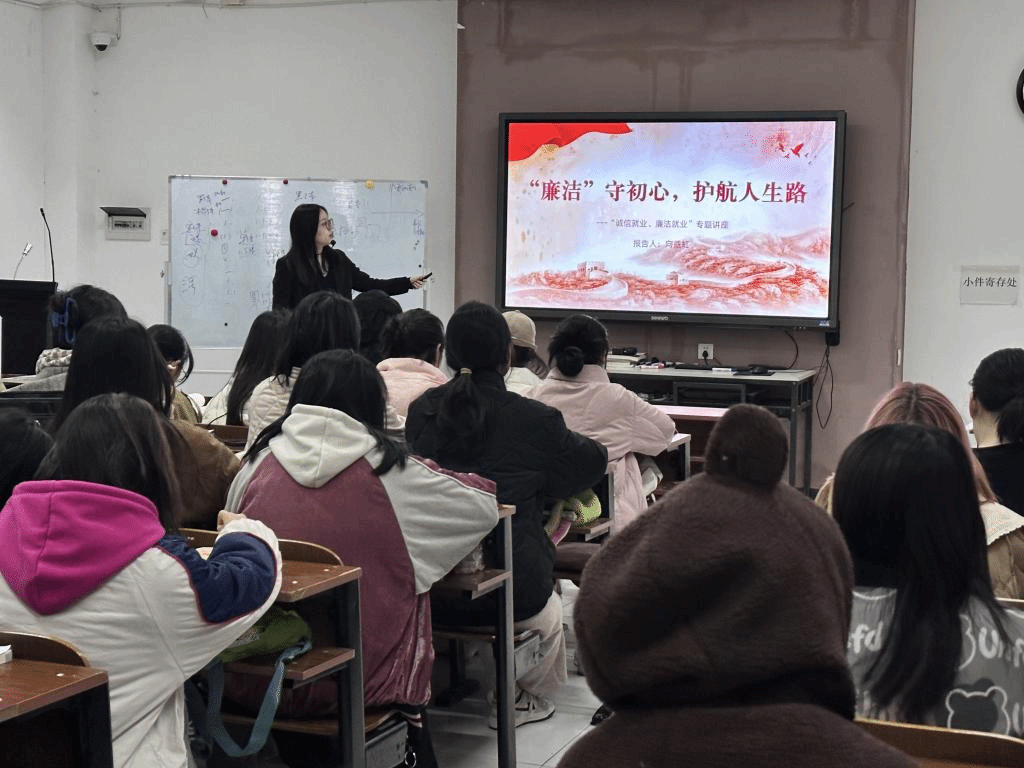 12月1日,向益虹老师为学生开展了《“廉洁”守初心,护航人生路》诚信就业、廉洁就业专题讲座。她跟学生分享了廉洁教育的重要性,提醒同学们在未来无论从事何种职业,都要永葆廉洁初心,严守职业道德。一是要做到知敬畏,不改其心、不移其志、不毁其节。二是要强本领,树立终身学习意识,不断突破自我,增强自身本领。三是要建功立业,勇担国家责任、社会责任和家庭责任,百折不挠。四是要常回家,不忘父母,不忘母校,家跟学校是毕业生们永远的精神家园和坚强后盾。