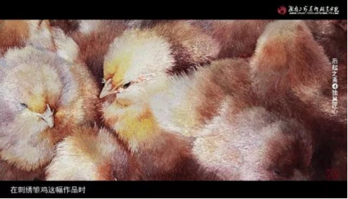 在刺绣《雏鸡》这幅作品时,她找到刚刚出生的一窝小鸡,观察它们的毛发长势、质感、神态。