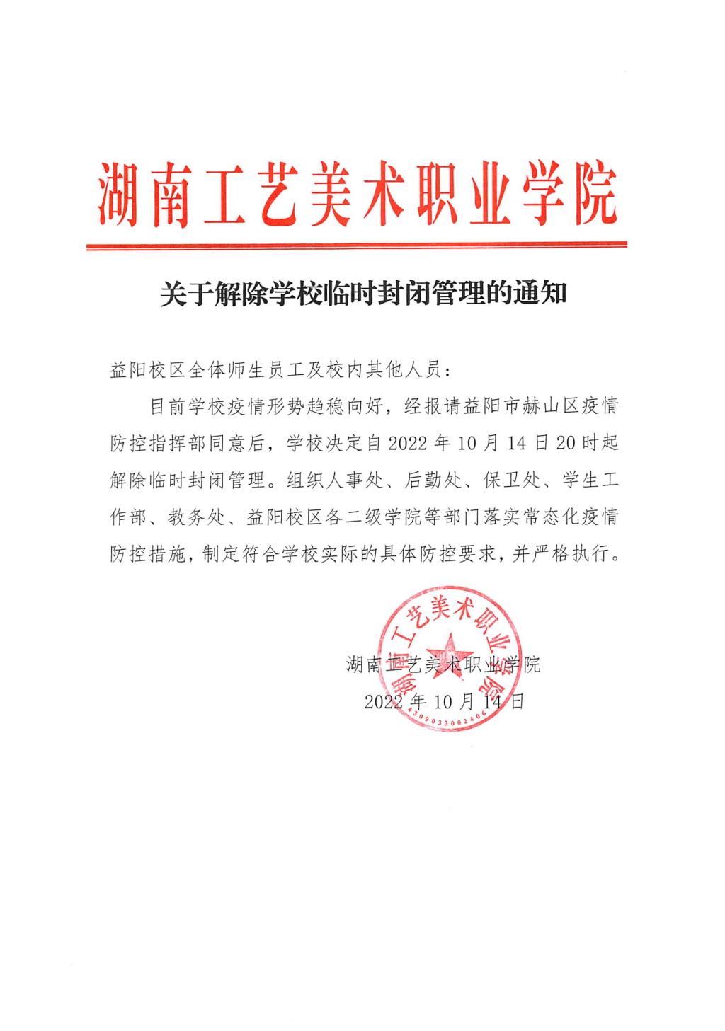 关于解除学校临时封闭管理的通知