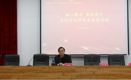 高建民在会上作了题为“凝心聚力、真抓实干,共同开创学院发展新局面”的报告,解读了《服装艺术设计学院2021年工作计划》,高建民指出,本次会议主题是安排部署今年的工作,学院将通过“六抓六新”的新举措,争创新成绩。—抓党建工作,充分发挥总支作用再拓新途径;二抓教学常规,扎实推进教学工作再创新业绩;三抓科研质量,着力促进教师研创再筑新能力;四抓重点项目,全面推动双高建设再上新台阶;五抓学生管理,积极探索三全育人再谱新篇章;六抓招生就业,力争促进生源就业再现新飞跃。完成全年工作关键在于落实。高建民要求,每一位教职工要在思想上提高认识,有甘于奉献精神;在行动上积极肯干,要服从学院安排;在方法上注重技巧,要提升工作效率。