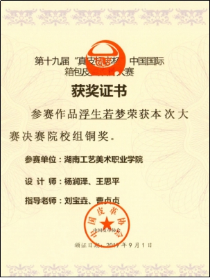 7.2019年9月润泽、王思平同学的作品《浮生若梦》荣获十九届“真皮标志杯”中国国际箱包皮具设计大赛决赛院校组铜奖。
