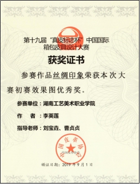 8.2019年9月李英莲同学的作品《丝绸印象》荣获十九届“真皮标志杯”中国国际箱包皮具设计大赛初赛效果图优秀奖。