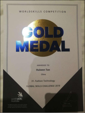 1.2019年4月谭惠文同学在2019年澳大利亚全球技能挑战赛上荣获时装技术项目金奖。
