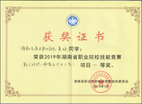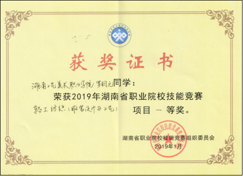 2.2019年1月盘慧仪同学在2019年湖南省职业院校技能竞赛高职组服装设计与工艺项目荣获一等奖。