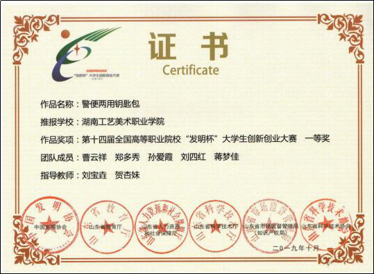 9.2019年10月曹云祥、郑多秀、孙爱霞、刘四红、蒋梦佳同学的作品:《警便两用钥匙包》荣获第十四届全国高等职业院校“发明杯”大学生创新创业大赛一等奖。