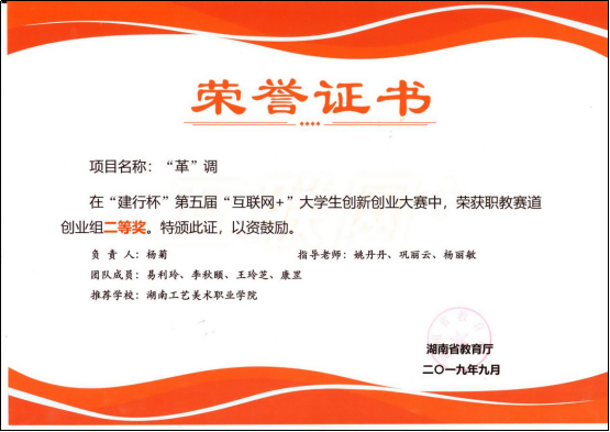 10.2019年9月易利玲、李秋颐、王玲芝、康罡同学的项目:“革”调 荣获“建行杯”第五届湖南省“互联网+”大学生创新创业大赛,职教赛道创业组二等奖。