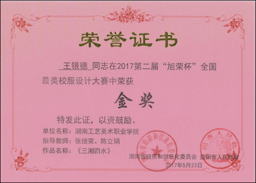 1.2017年5月王银德同学在2017年第二届旭荣杯全国最美校服设计大赛中荣获金奖。