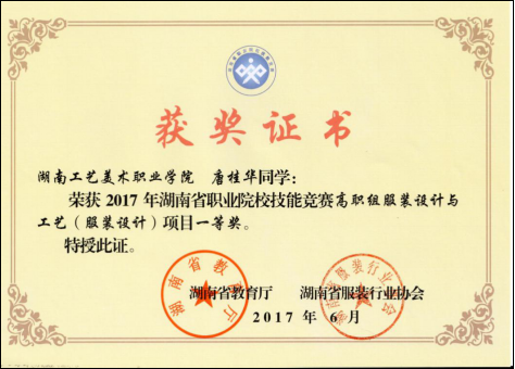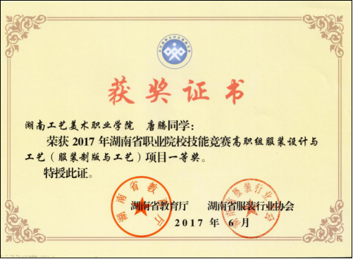 2.2017年6月唐腾同学在2017年湖南省职业院校技能竞赛高职组服装设计与工艺项目中荣获一等奖。
