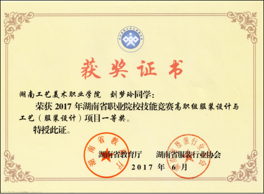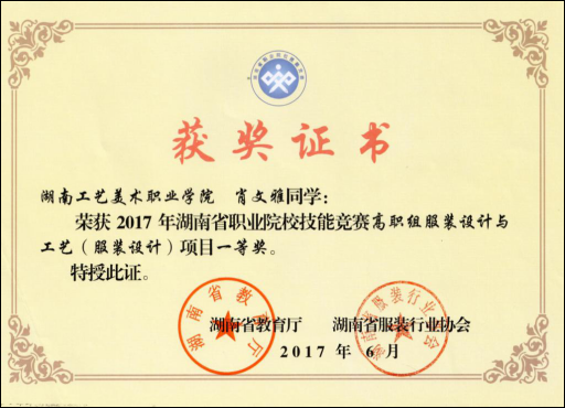 6.2017年6月肖文雅同学在2017年湖南省职业院校技能竞赛高职组服装设计与工艺项目中荣获一等奖。
