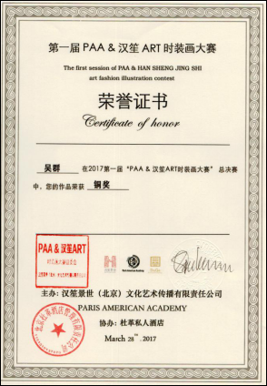 11.2017年3月吴群同学在第一届汉笙时装画大赛中荣获铜奖。