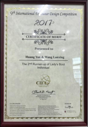 8.2017年6月黄琰、王蓝星同学在IFDC2017国际鞋类设计比赛中荣获季军。