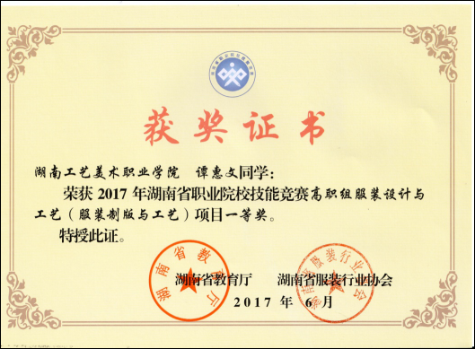 4.2017年6月谭惠文同学在2017年湖南省职业院校技能竞赛高职组服装设计与工艺项目中荣获一等奖。