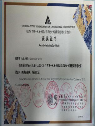 10.2017年4月任梦雨同学在2017年第十七届全国纺织品设计大赛中荣获铜奖。