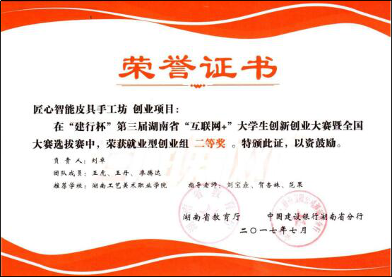 14.2017年7月刘卓、王虎、王丹、廖腾达同学的作品:“匠心智能皮具手工坊”创业项目荣获“建行杯”第三届湖南省“互联网+”大学生创新创业大赛全国选拔赛,就业型创业组二等奖。