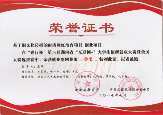 13.2017年7月袁园、王艺璇、何叶玲、史丹、王虎同学的作品:“基于侗文化传播的时尚网红培育项目”创业项目荣获“建行杯”第三届湖南省“互联网+”大学生创新创业大赛全国选拔赛,就业型创业组一等奖。