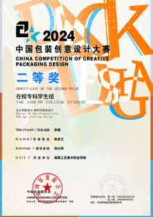 2024年9月张永兰学生,荣获中中国包装创意设计大赛在校专科毕业生组新时代服装设计赛项二等奖。