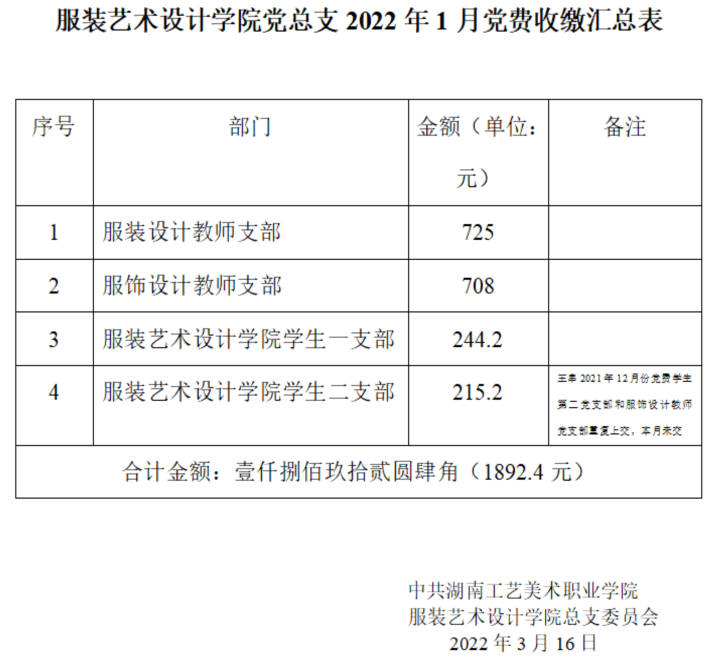 服装艺术设计学院党总支2022年1月党费收缴汇总表