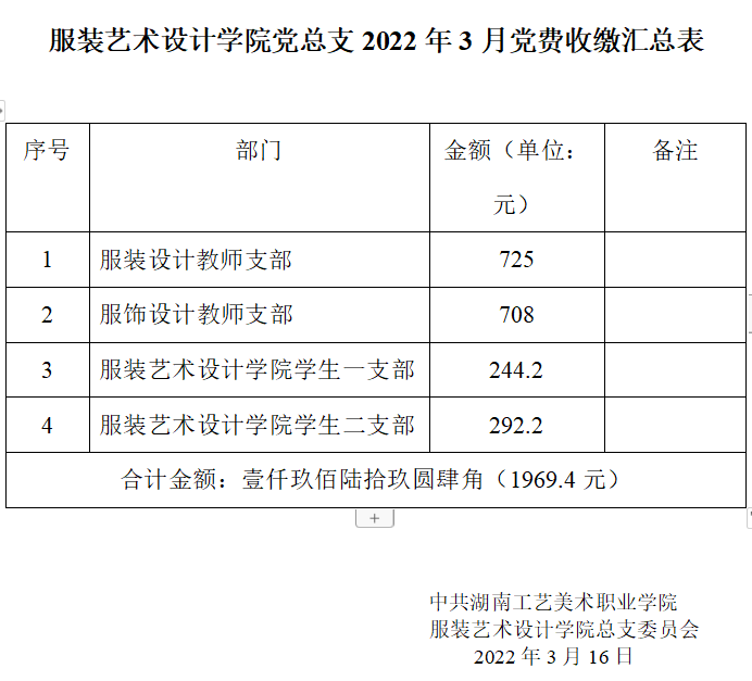 服装艺术设计学院党总支2022年3月党费收缴汇总表
