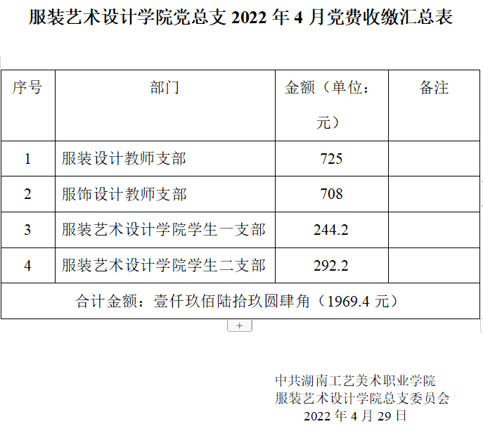 服装艺术设计学院党总支2022年4月党费收缴汇总表